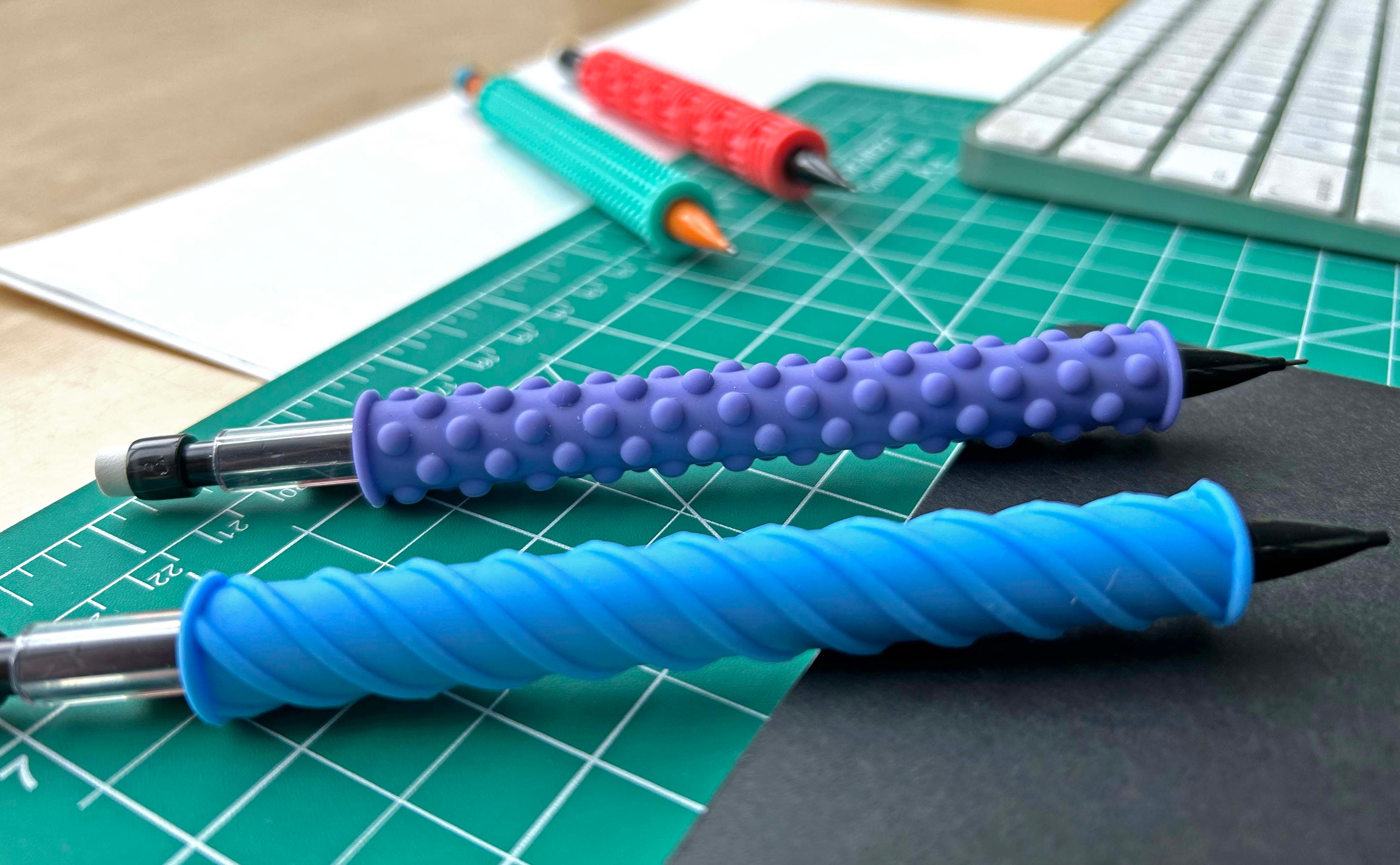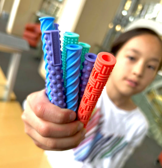 Gidgets are sensory tools that go with you to school or work. Slip the silicone sleeve on your pencil, and ta-da! You've got a textured writing implement that will keep your fingers satisfied and your brain focused.